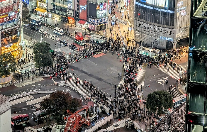 Shibuya Crossing er verdens mest travle fodgængerfelt og et symbol på den dynamik, der kendetegner Tokyo. Når lysene skifter til grønt, strømmer hundreder af mennesker ud fra alle retninger på én gang – et tilsyneladende kaotisk, men forbløffende organiseret øjeblik. Rundt om krydset ligger tårnhøje bygninger med reklameskærme, shoppingcentre og caféer, herunder den berømte statue af den loyale hund Hachikō, et populært mødested med en rørende historie.