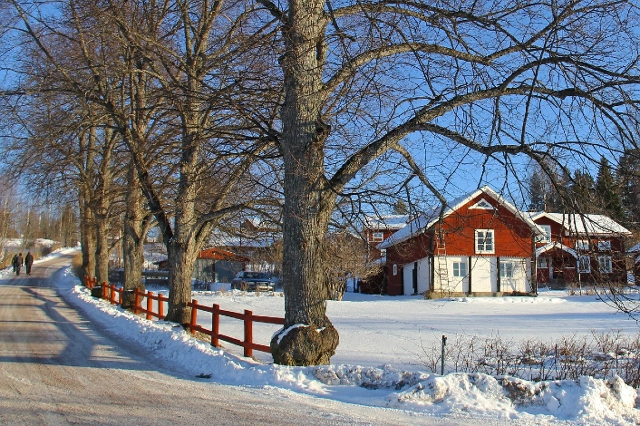 Svensk vinter og den klassiske svenske byggestil med huse i træ.